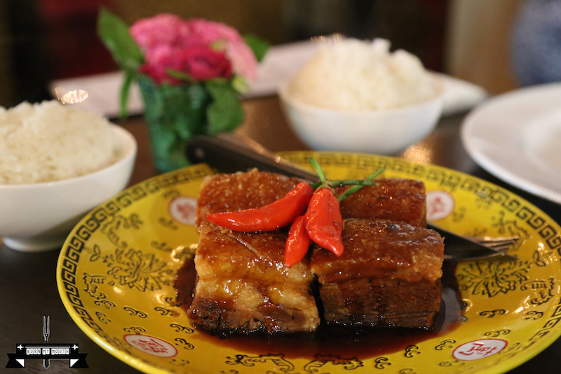 The dish came out with four big slices of pork bellies, with three red chillies on top, served on a colourful Chinese plate.