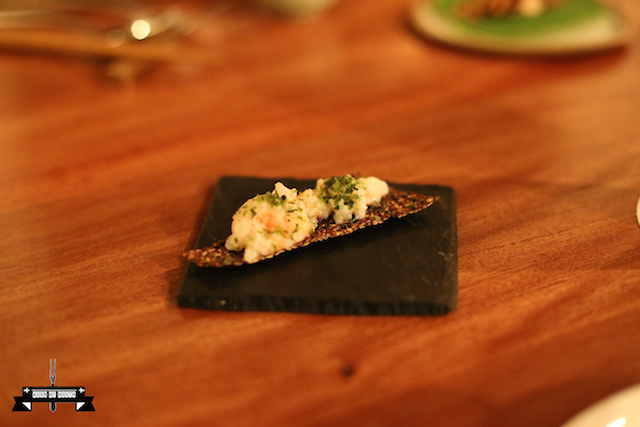 Spanner crab and black garlic on seed biscuit ($7.50 each)